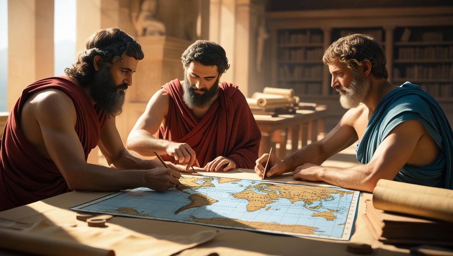 Die Griechen waren bahnbrechend in der Kartografie. Anaximander erstellte im 6. Jahrhundert v. Chr. eine der ersten Weltkarten, die die Erde als zylindrische Form mit Landmassen und Ozeanen darstellte. Hekatäus von Milet verfeinerte diese Karte, indem er erstmals detaillierte geografische Informationen aus verschiedenen Reiseberichten sammelte. Diese frühen Karten waren der Beginn der Geografie als Wissenschaft.