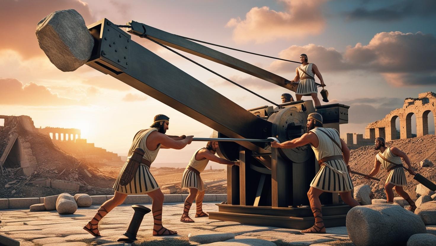 Die Griechen erfanden eine der ersten mechanischen Belagerungswaffen: das Schleuderkatapult (Ballista). Dieses Gerät konnte große Pfeile, Speere oder Steine mit enormer Geschwindigkeit auf Feinde oder Festungen schleudern. Es revolutionierte die Kriegsführung und war eine der gefürchtetsten Waffen seiner Zeit.