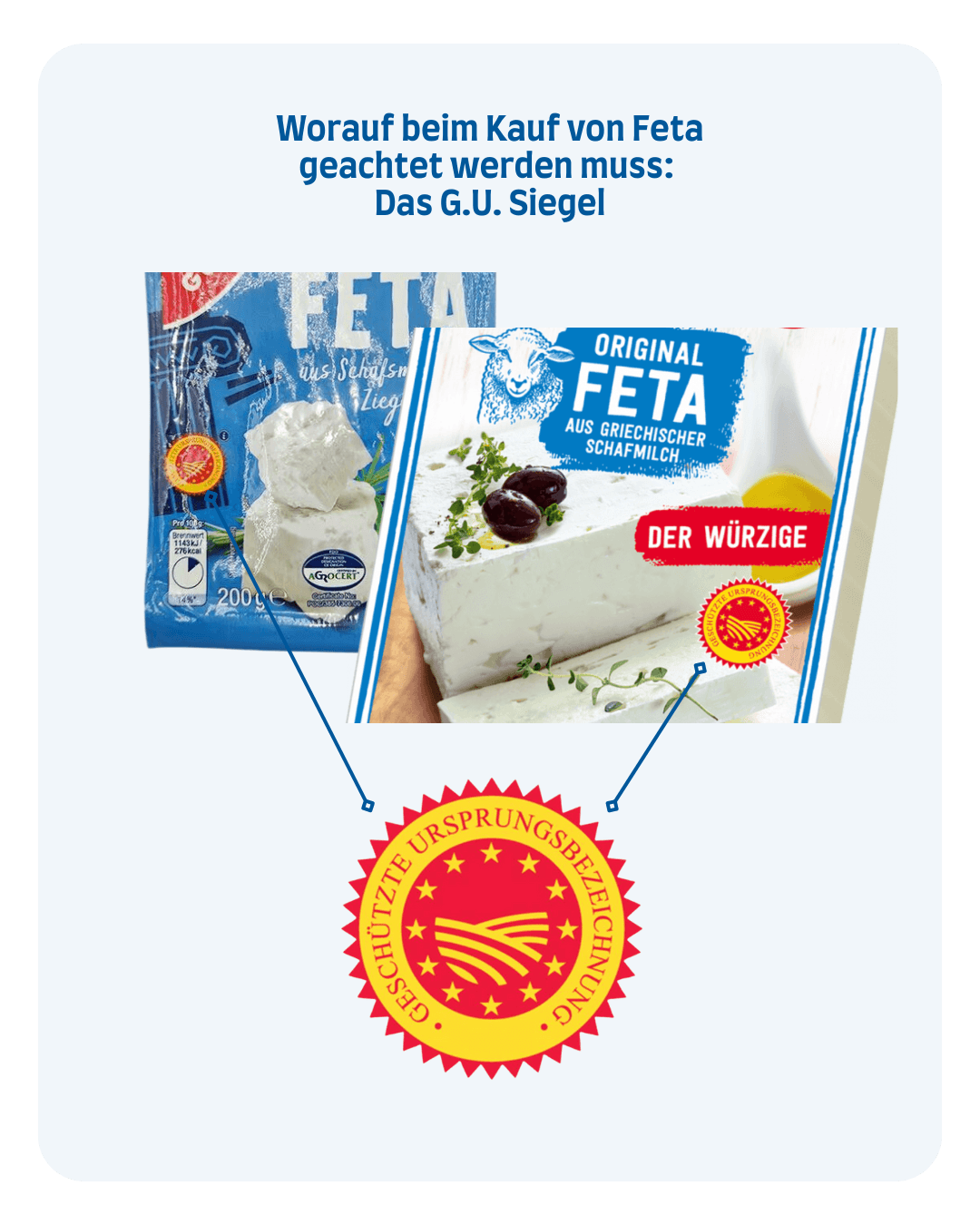 Feta ist nicht einfach nur ein Name, sondern eine geschützte Ursprungsbezeichnung in der EU. Das bedeutet, dass echter Feta nur in bestimmten Regionen Griechenlands und unter strengen Vorgaben hergestellt werden darf. Diese Vorgaben legen fest, dass Feta aus mindestens 70 % Schafsmilch und höchstens 30 % Ziegenmilch bestehen muss. Beim Kauf von Feta sollte man daher immer auf das G.U.-Siegel achten, das die Echtheit des Produkts garantiert.