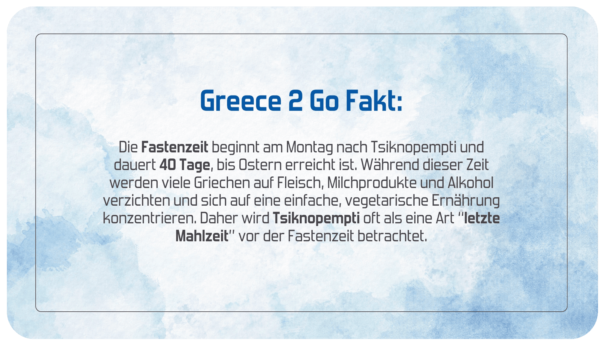 Die Fastenzeit beginnt am Montag nach Tsiknopempti und dauert 40 Tage, bis Ostern erreicht ist.